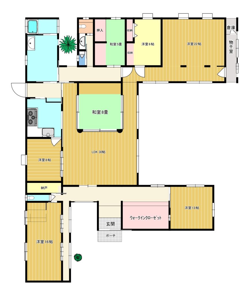| 設備・条件 | 三口コンロ システムキッチン 給湯 洗髪洗面化粧台 バス専用 シャワー トイレ専用 エアコン W.INクローゼット 室内洗濯機置き場 公営水道 井戸 排水下水 駐車場有 駐輪場 専用庭 出窓 フローリング トイレ2か所、ウォークインクローゼット、照明器具ダウンライト、エアコン、シャッター雨戸 |