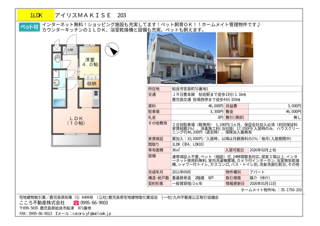 | 所在地 | 鹿児島県姶良市 宮島町51番地1 アイリスMAKISE |
